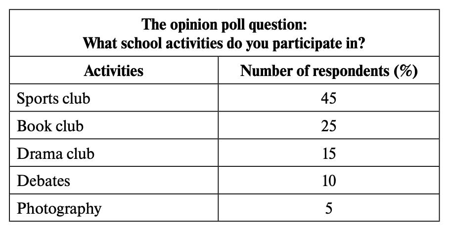 Imagine that you are doing a project on what school activities teenagers in Zetland participate in. You have found some data on the subject – the results of a survey (see the table below). Comment on the survey data and give your opinion on the subject of the project.