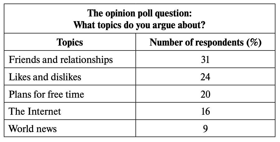 Imagine that you are doing a project on what topics teenagers argue about in Zetland. You have found some data on the subject – the results of a survey (see the table below). Comment on the survey data and give your opinion on the subject of the project.