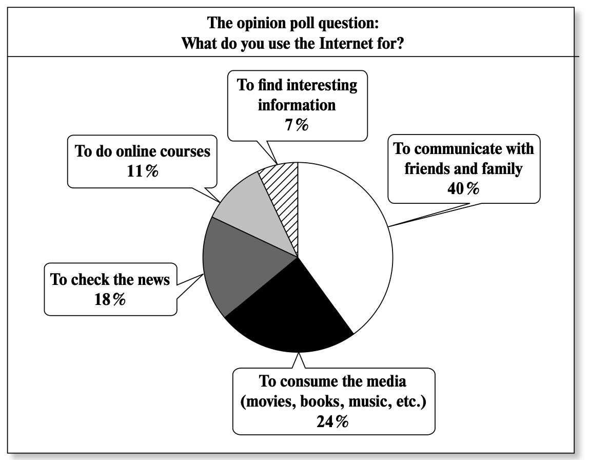 Imagine that you are doing a project on what people in Zetland use the Internet for. You have found some data on the subject – the results of a survey (see the pie chart below). Comment on the survey data and give your opinion on the subject of the project.