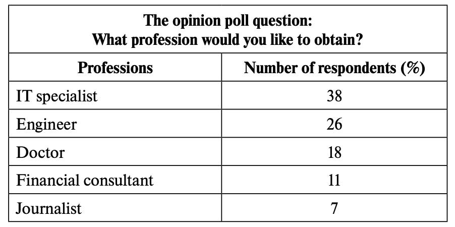 Imagine that you are doing a project on what professions teenagers would like to obtain in Zetland. You have found some data on the subject – the results of a survey (see the table below). Comment on the survey data and give your opinion on the subject of the project.