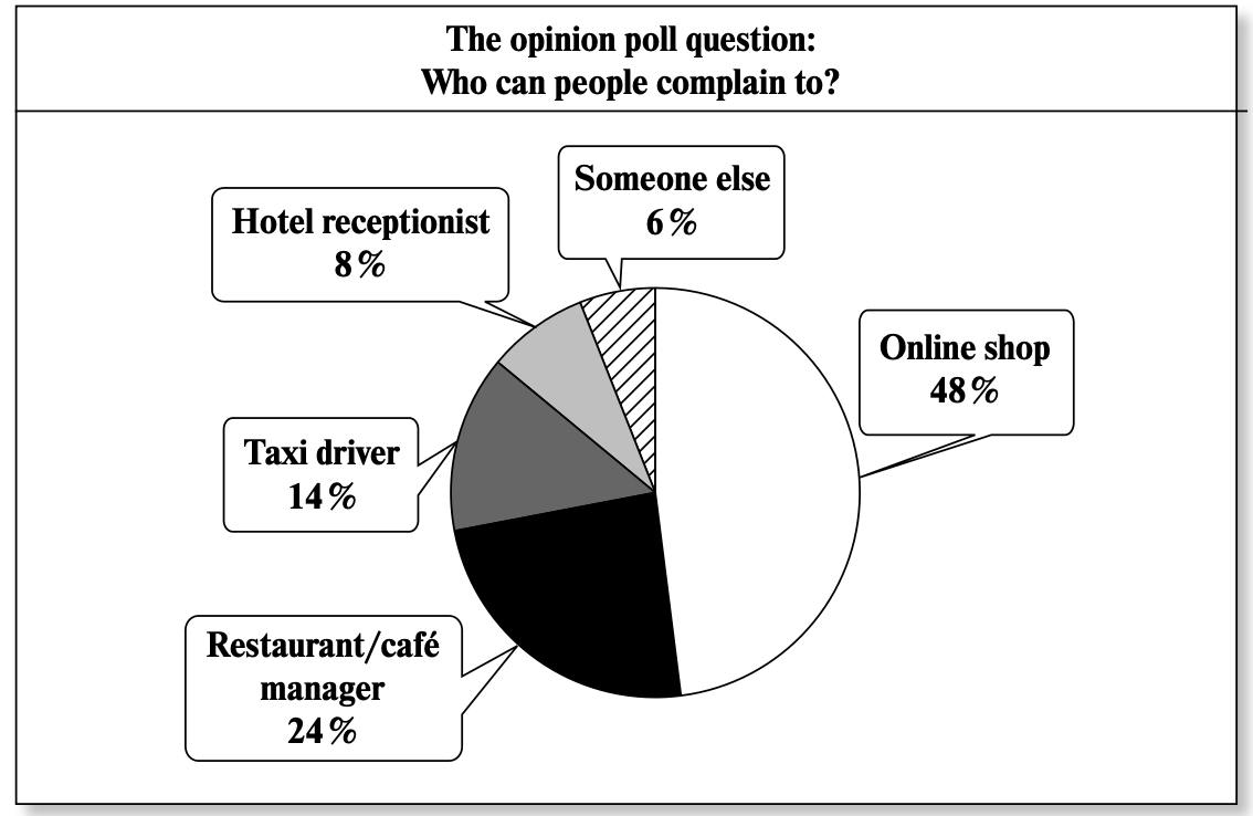 Imagine that you are doing a project on who people can complain to in Zetland. You have found some data on the subject – the results of a survey (see the pie chart below). Comment on the survey data and give your opinion on the subject of the project.