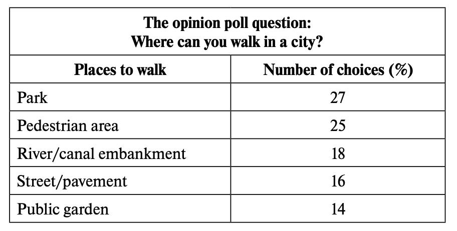 Imagine that you are doing a project on where teenagers can walk in a city in Zetland. You have found some data on the subject – the results of a survey (see the table below). Comment on the survey data and give your opinion on the subject of the project.