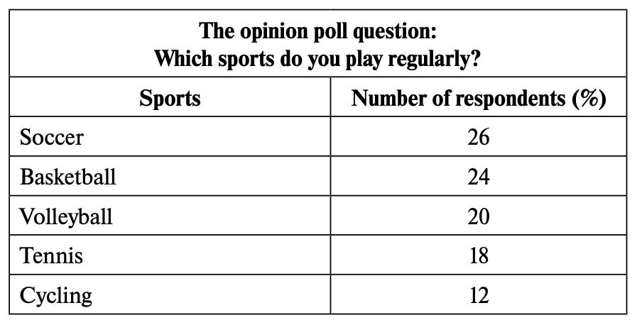 Imagine that you are doing a project on what sports teenagers in Zetland play regularly. You have found some data on the subject – the results of a survey (see the table below). Comment on the survey data and give your opinion on the subject of the project.