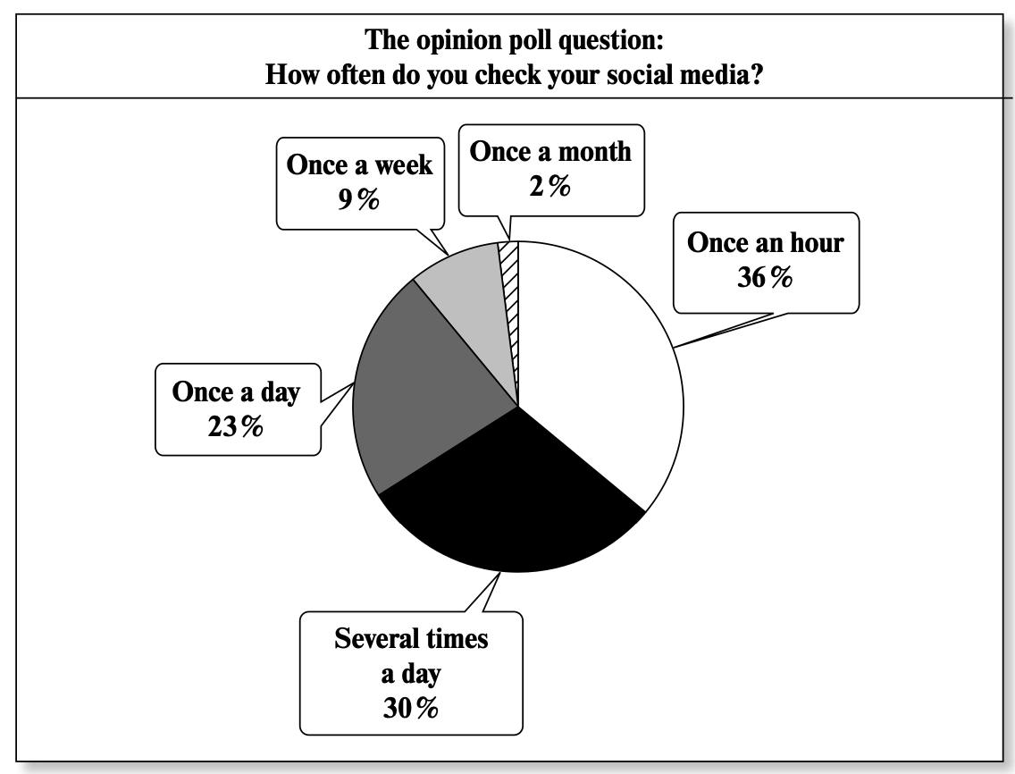 Imagine that you are doing a project on how often teenagers in Zetland check their social media. You have found some data on the subject – the results of a survey (see the pie chart below). Comment on the survey data and give your opinion on the subject of the project.