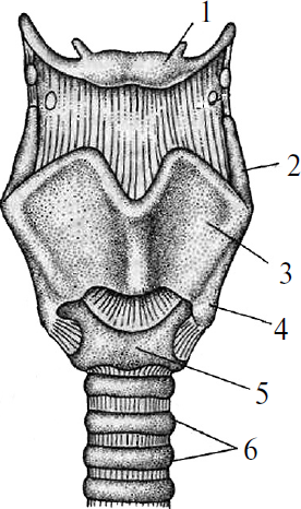 | А) Образует заметный «кадык» на передней поверхности шеи Б) Имеет форму «перстня» В) Сложен множеством полукольцевых (С-образных) пластин, открытых кзади Г) Своими верхними рогами сочленяется с подъязычной костью Д) Участвует в образовании перстнещитовидного сустава, регулирующего натяжение голосовых связок Е) Повторяется серией одинаковых сегментов до бифуркации трахеи | 1) 3 2) 5 3) 6 |