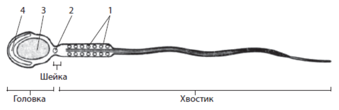 Установите соответствие между характеристиками и структурами сперматозоида, обозначенными на рисунке цифрами 1, 2, 3, 4. К каждой позиции из первого столбца подберите соответствующую позицию из второго.