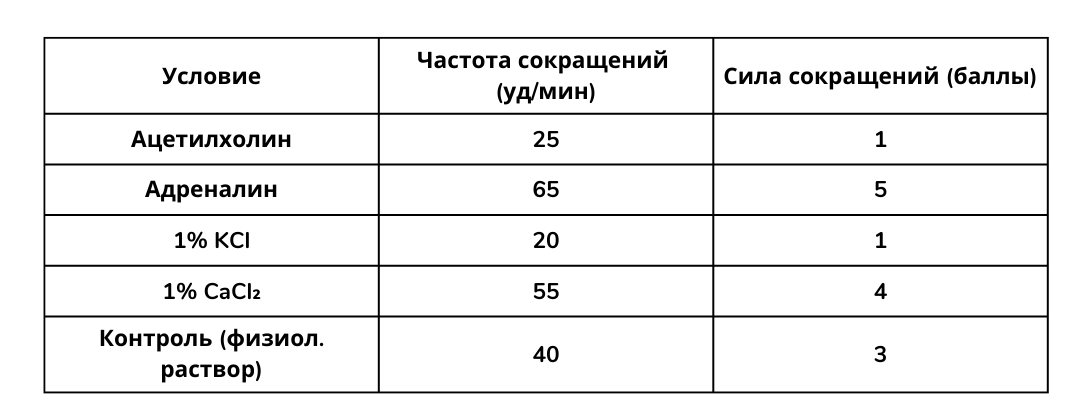 Экспериментатор исследовал влияние различных веществ на работу изолированного сердца лягушки. Для этого он помещал сердце на часовое стекло, добавлял физиологический раствор и по каплям вносил одно из следующих веществ: ацетилхолин, адреналин, 1%-ный раствор KCl, 1%-ный раствор CaCl₂. После внесения каждого вещества он фиксировал частоту сердечных сокращений и силу ударов.