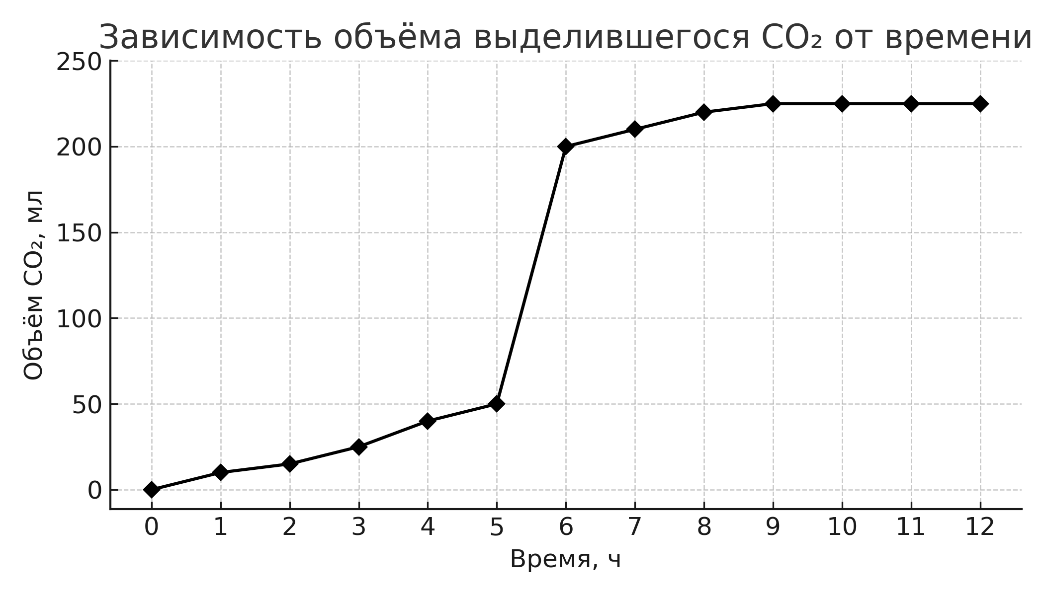 Экспериментатор исследовал особенности спиртового брожения хлебопекарных дрожжей (Saccharomyces cerevisiae). В 10 пробирок он внёс одинаковую питательную среду, дополнительно добавил сахарозу, а затем одинаковый объём взвеси дрожжей. В ходе эксперимента он измерял объём выделившегося углекислого газа. Средние значения отражены на графике.