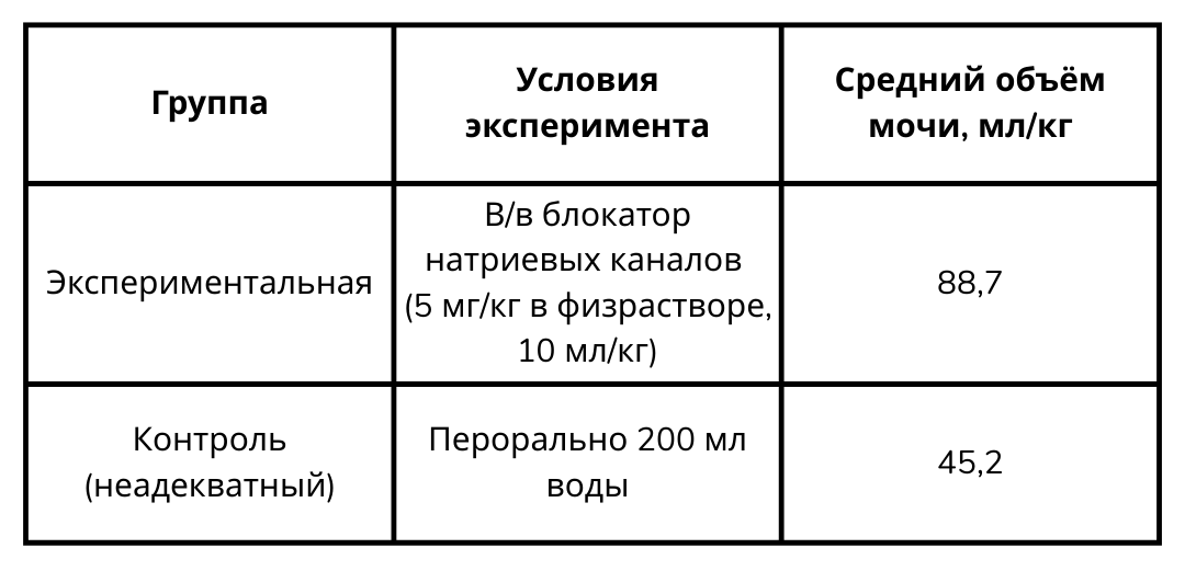 Учёные изучали влияние блокатора натриевых каналов на объём мочи. Крысам вводили препарат, нарушающий реабсорбцию Na⁺ в проксимальных канальцах. В качестве отрицательного контроля взяли животное, которому дали выпить 200 мл воды, но не вводили ничего внутривенно. Результаты эксперимента представлены в таблице.