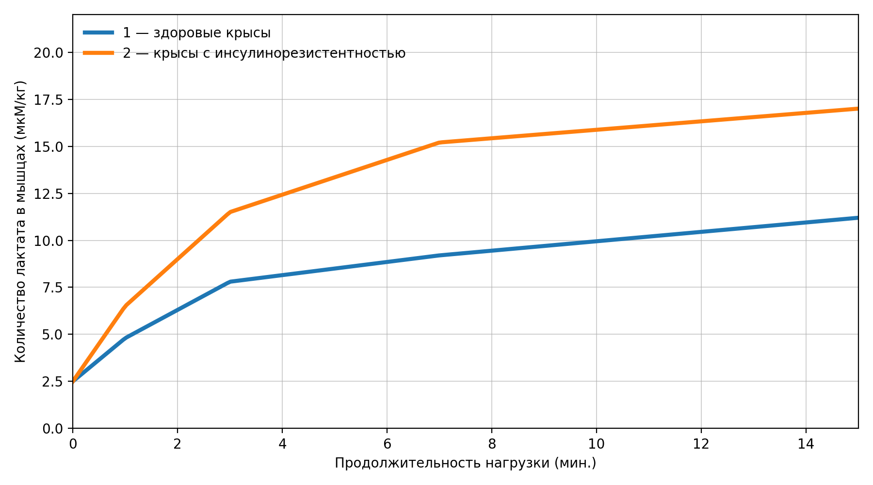Экспериментатор изучал особенности физиологии мышц у лабораторной крысы (Rattus norvegicus). Для этого он исследовал биохимические параметры здоровых и имеющих инсулинорезистентность крыс (модель метаболических нарушений), подвергая их одинаковой мышечной нагрузке.