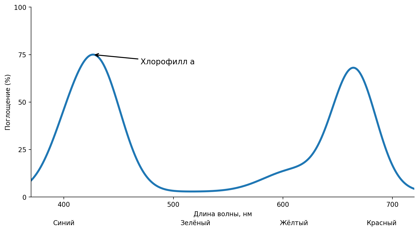 Проростки гороха посевного (Pisum sativum) поместили в специальную тёмную камеру и в течение всего эксперимента освещали только зелёным светодиодом. Через 12 дней все растения пожелтели и погибли. Как можно объяснить результаты опыта? Светодиодами каких цветов необходимо освещать растения, чтобы они нормально росли и развивались? Ответ поясните, используя прилагаемый график. Какие вспомогательные фотосинтетические пигменты, кроме хлорофилла, известны у высших растений?