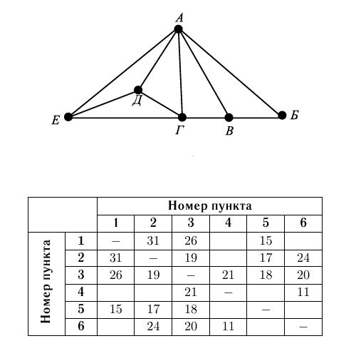 На рисунке изображена схема дорог в виде графа, в таблице содержатся сведения о протяжённости этих дорог (в километрах). Так как таблицу и схему рисовали независимо друг от друга, то нумерация населённых пунктов в таблице никак не связана с буквенными обозначениями на графе.