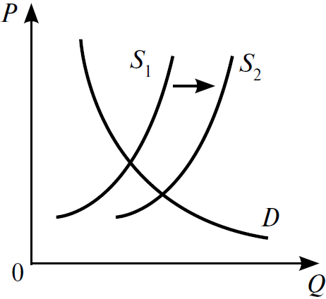 На графике изображено изменение ситуации на потребительском рынке услуг по доставке пиццы в городе Z. Кривая предложения переместилась из положения S1 в положение S2 при неизменном спросе D. (На графике P — цена товара; Q — количество товара.)