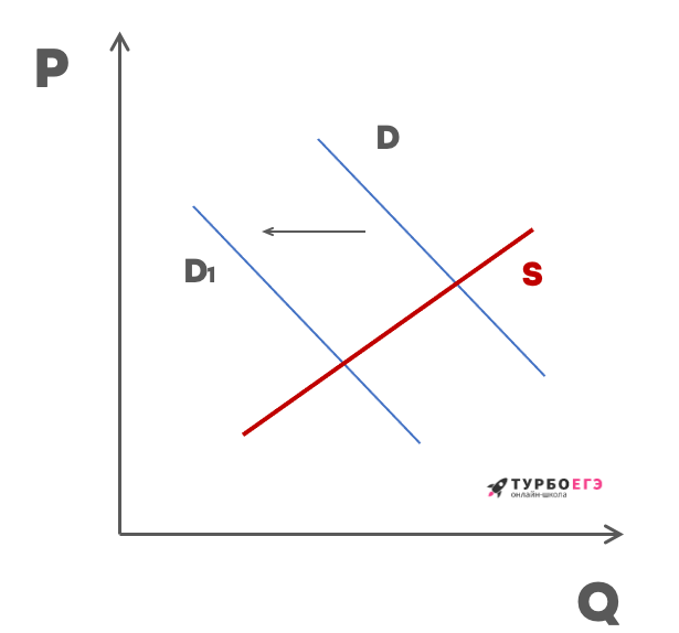 На графике изображено изменение ситуации на рынке арбузов. Кривая спроса переместилась из положения D в положение D1 при неизменном предложении S. (На графике Р — цена услуг; Q — количество услуг.)