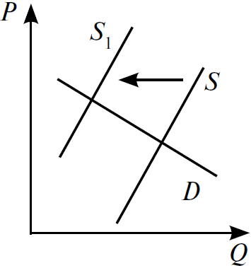 На графике изображено изменение ситуации на потребительском рынке жилья в стране Z. Кривая предложения переместилась из положения S в положение S1 при неизменном спросе D. (На графике P — цена товара; Q — количество товара.) Как изменилась равновесная цена?