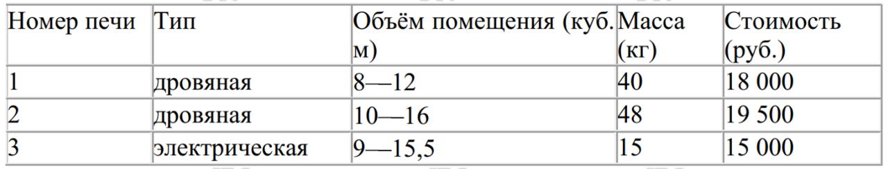 Хозяин дачного участка строит баню с парным отделением. Парное отделение имеет размеры: длина 3,5 м, ширина 2,2 м, высота 2 м. Окон в парном отделении нет, для доступа внутрь планируется дверь шириной 60 см, высота дверного проёма 1,8 м. Для прогрева парного отделения можно использовать электрическую или дровяную печь. В таблице представлены характеристики трёх печей. Для установки дровяной печи дополнительных затрат не потребуется. Установка электрической печи потребует подведения специального кабеля, что обойдётся в 6500 руб.