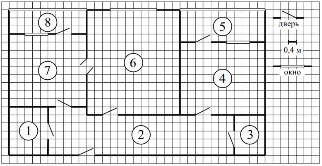 На рисунке изображён план двухкомнатной квартиры в многоэтажном жилом доме. Сторона одной клетки на плане соответствует 0,4 м, а условные обозначения двери и окна приведены в правой части рисунка. Вход в квартиру находится в коридоре. Слева от входа в квартиру находится санузел, а в противоположном конце коридора — дверь в кладовую. Рядом с кладовой находится спальня, из которой можно пройти на одну из застеклённых лоджий. Самое большое по площади помещение — гостиная, откуда можно попасть в коридор и на кухню. Из кухни также можно попасть на застеклённую лоджию.