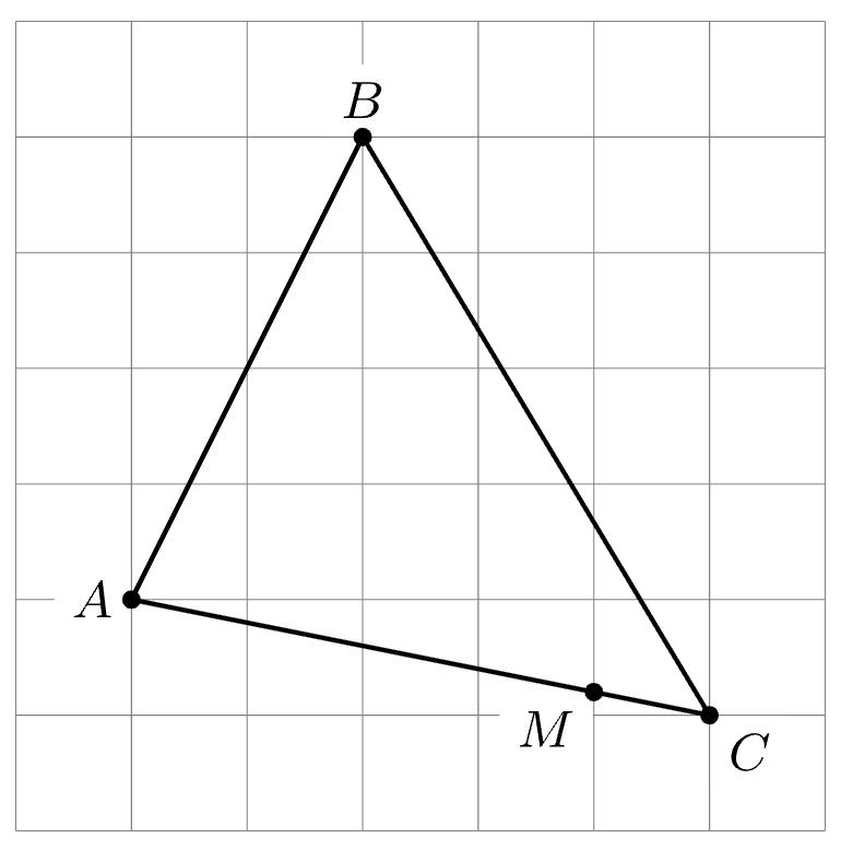 На клетчатой бумаге изображён треугольник $ABC$. Во сколько раз отрезок $AM$ длиннее отрезка $CM$?