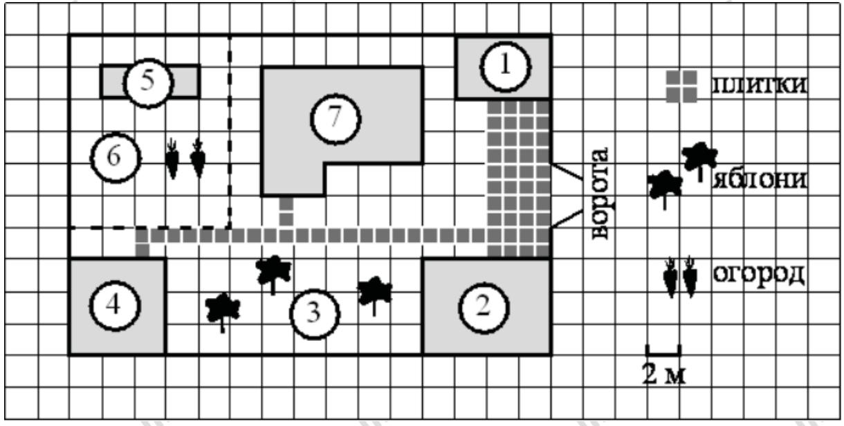 На плане изображён дачный участок по адресу: п. Сосновка, ул. Зелёная, д. 19 (сторона каждой клетки на плане равна 2 м). Участок имеет прямоугольную форму. Выезд и въезд осуществляются через единственные ворота. При входе на участок слева от ворот находится гараж. Справа от ворот находится сарай площадью 24 кв. м, а чуть подальше — жилой дом. Напротив жилого дома расположены яблоневые посадки. Также на участке есть баня, к которой ведёт дорожка, выложенная плиткой, и огород с теплицей внутри (огород отмечен на плане цифрой 6). Все дорожки внутри участка имеют ширину 1 м и вымощены тротуарной плиткой размером 1 м×1 м. Между гаражом и сараем находится площадка, вымощенная такой же плиткой. К участку подведено электричество. Имеется магистральное газоснабжение.