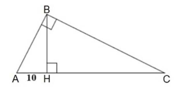 Точка H является основанием высоты, проведённой из вершины прямого угла B треугольника ABC к гипотенузе AC. Найдите AB, если AH = 10, AC = 40.